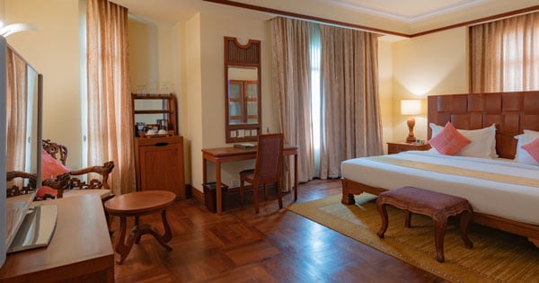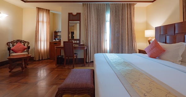 | Deluxe City View | Khmer Traditional Temple View or Sivatha Street View | 144 | 38 sqm | 1st to 5th Floor | One Hollywood, King or Twin Bed | Separate shower stall and bathtub | Hollywood/King/Twin Bed: 2 Adults and 2 Children under 5 years old | Cable color television, individual air conditioning, in-house telephone, Wi-Fi, a kettle with complimentary coffee and tea-making ingredients, mini-bar and personal safety Box. |