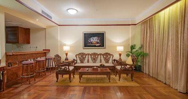 | Apsara Suite | City View | 1 | 110 sqm | 2nd Floor | One Hollywood Bed | Separate shower stall and bathtub | Hollywood Bed: 2 Adults and 2 Children under 5 years old | The Suite is designed for comfort with a living area-room and dining area with kitchenette, cable color television, individual air conditioning, in-house telephone, Wi-Fi, a kettle with complimentary coffee and tea-making ingredients, mini-bar and personal safety Box. |