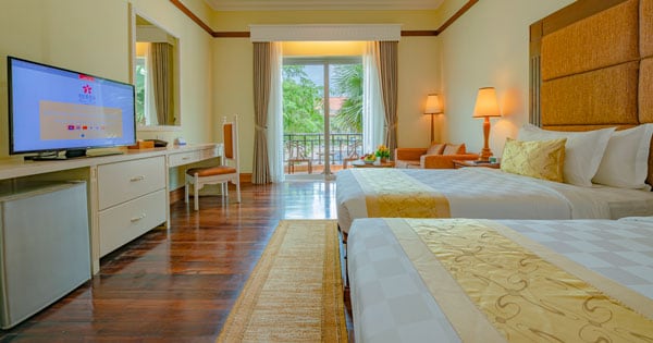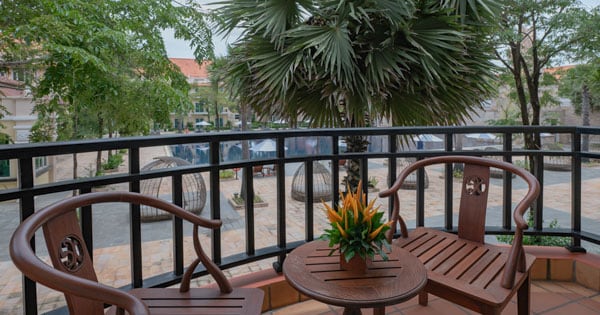 Delight in the sound of a man-made waterfall cascading into Siem Reap’s largest salt water swimming pool from the comfort of your own private balcony. As in the rest of the complex, your 40sqm guestroom has been created for a feeling of modern space and style whilst integrating key Cambodia design features into the mix. The option of king or twin bedding only adds to the list of conveniences you will find within the space which includes a 43” flat screen television with internet connectivity and complimentary wireless internet among many others.